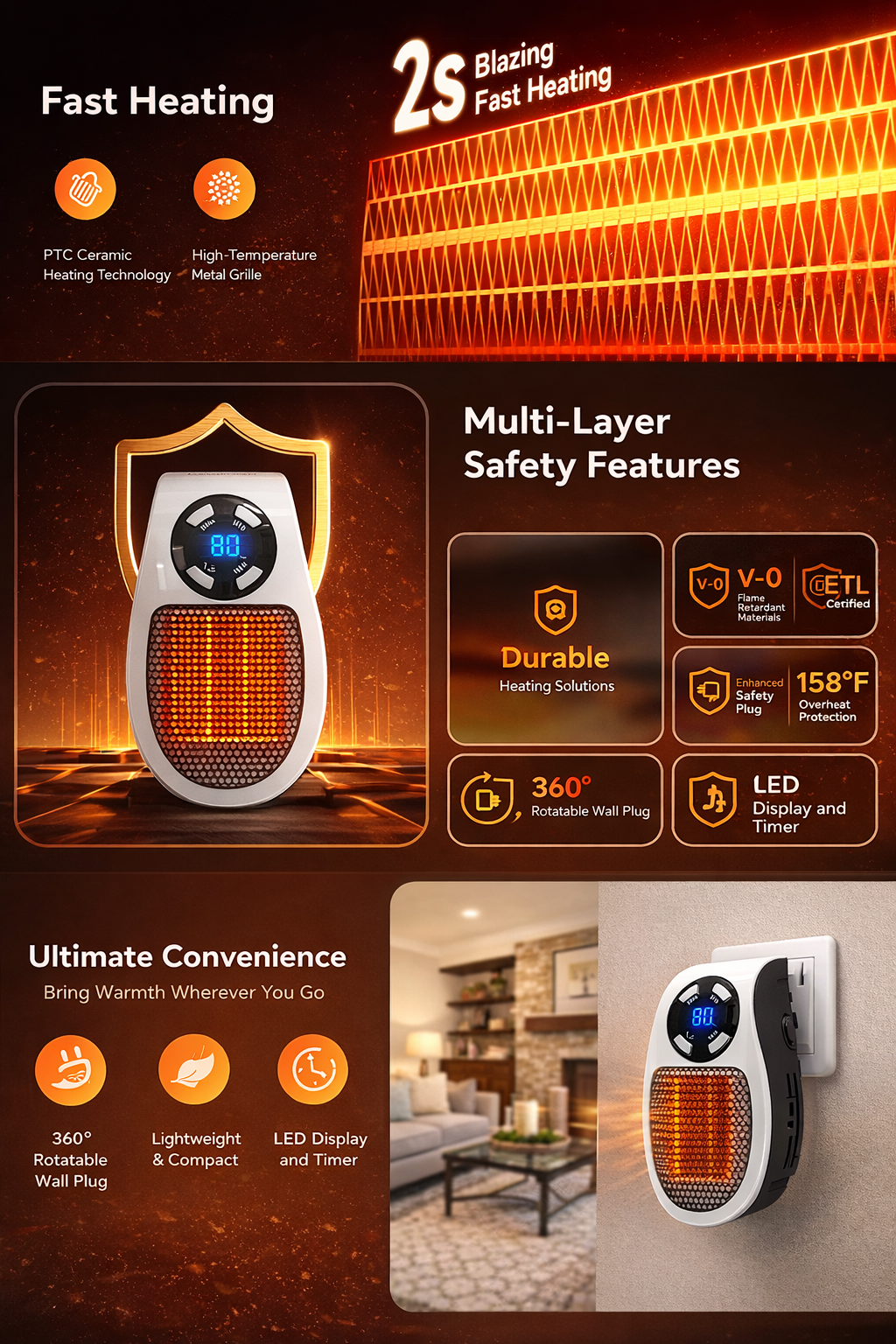 Transform chilly rooms into cozy comfort in seconds. This compact plug-in wall heater delivers powerful warmth right where you need it — without taking up floor space or cluttering your home.